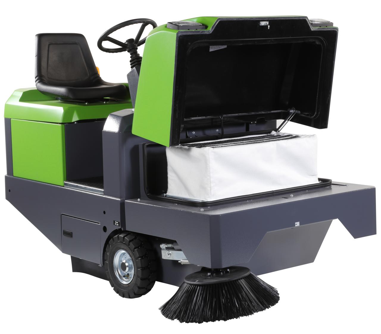 - Groot vuilreservoir met lift aan de voorzijde van de veegmachine voor het leegstorten tot een hoogte van 1325 mm.